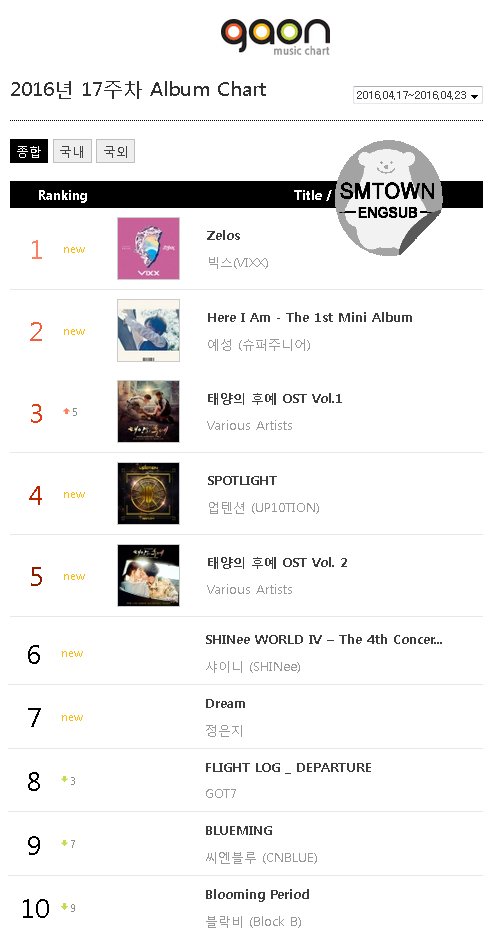 - ييسونغ المركز#11 هنري المركز#13 كيوهيون المركز#22في مخططGaonلأكثر الفنانين شهرة في الاسبوع الثالث من ابريل